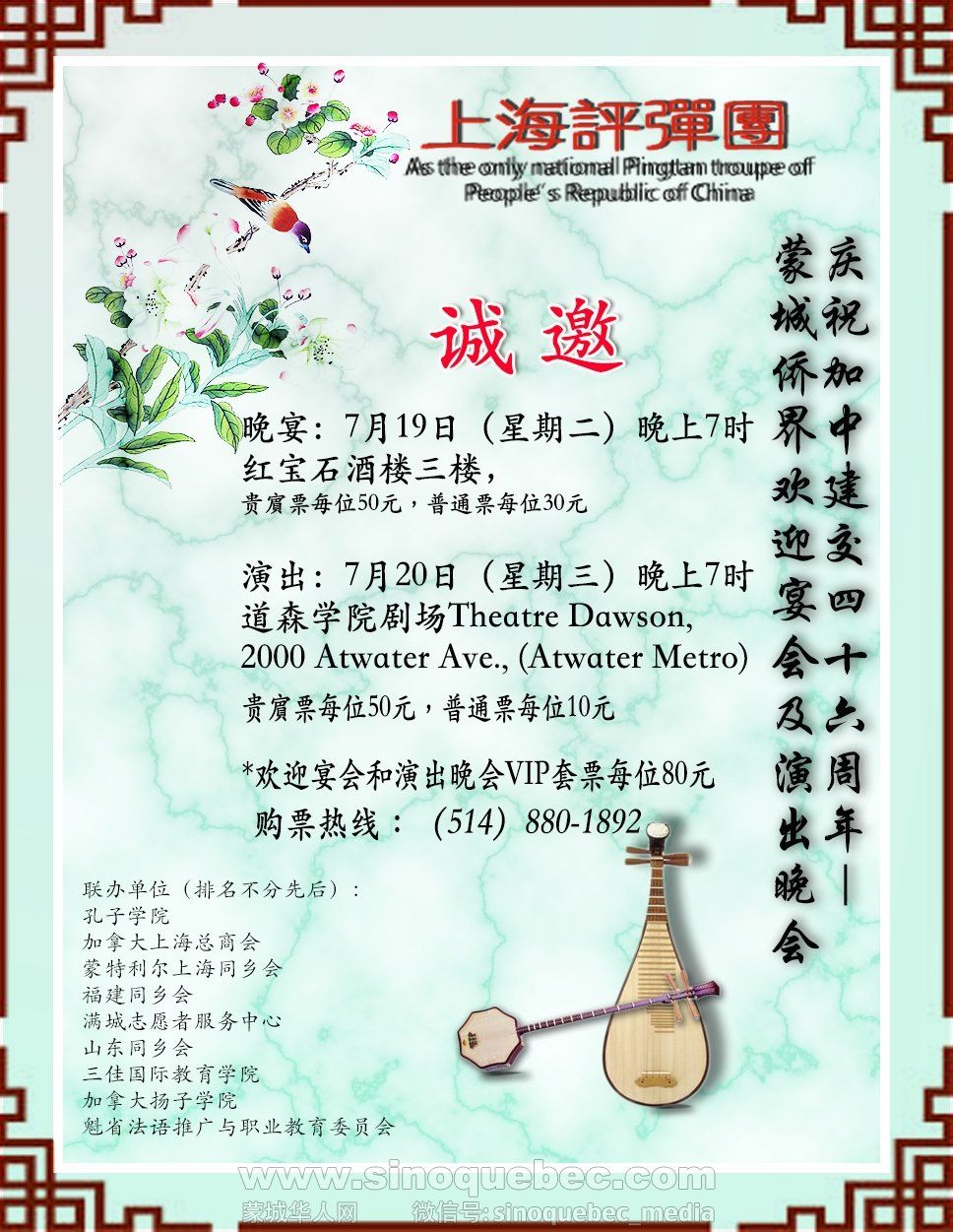 7月19日(星期二)晚上7时假座红宝石酒楼设宴欢迎上海评弹团一行访问蒙特利尔,同蒙市侨界人士作零距离交流,7月20日(星期三)晚上7时在道森学院剧场Theatre Dawson, 【2000 Atwater Ave., (Atwater Metro) Montreal, Quebec 】演出,同蒙特利尔的观众见面,誠挚邀请侨界领袖,艺术界人士,艺术爱好者踴跃参加,不勝荣幸!
