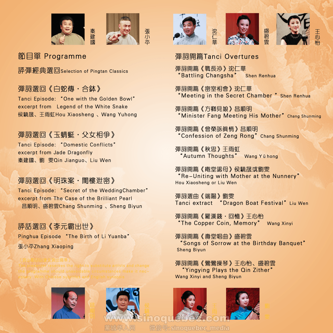 今年,上海评弹团加拿大访问交流演出, 演员阵容可谓强大。其中包括有国家一级演员秦建国、张小平、沈仁华等在内的十一名成员,相信届时一定让您和您的家人大饱眼福、耳福。